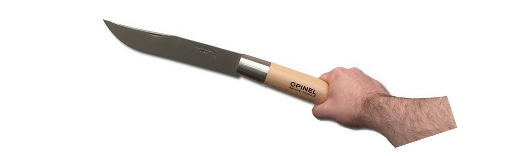 Le Géant… This VERY LARGE folding knife is aimed more at collectors of cutting tools than those wishing to use it, BUT, it is still a very functional tool and incorporates all of the features of a smaller Opinel Knife, such as the twist lock and beech wood handle. The knife measures 50cm overall, the blade being 22cm. The blade is constructed from carbon steel.