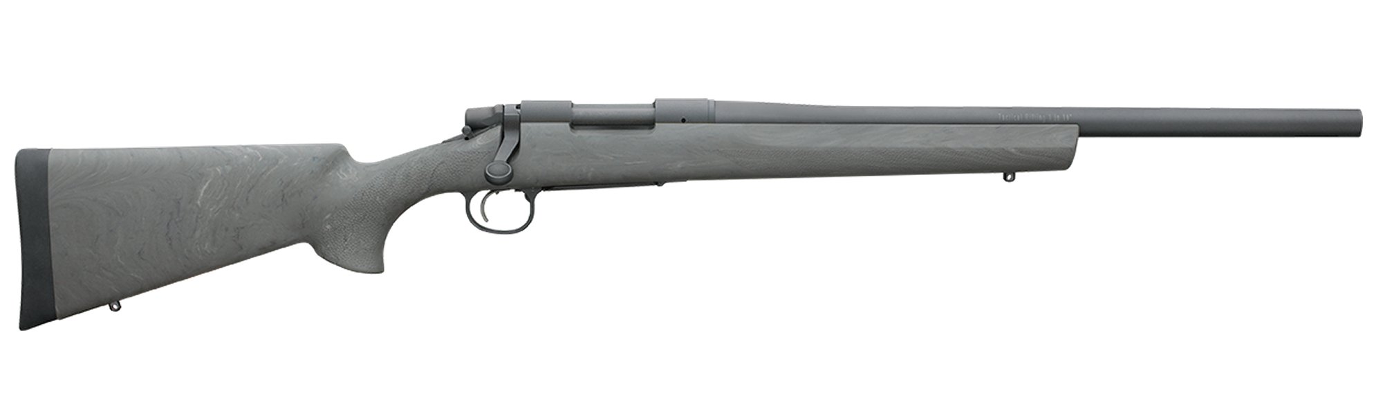The Model 700 SPS Tactical is a highly maneuverable member of the family. It’s built for tack-driving accuracy with a 20″ heavy-contour tactical-style barrel and dual-point pillar bedding in its black synthetic stock. Hogue® overmoldings on the stock facilitate sure handling, and it has a semi-beavertail fore-end for added stability off a rest.