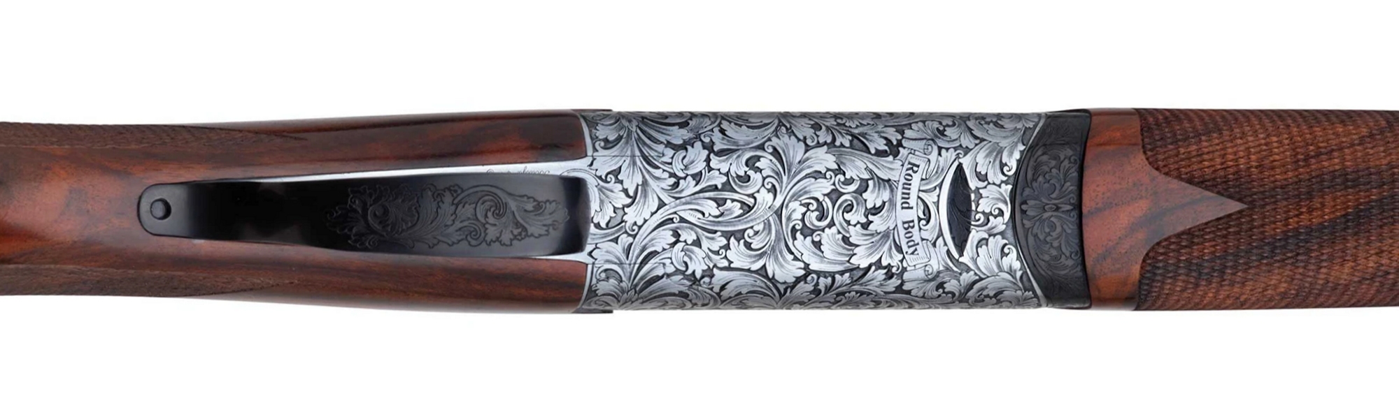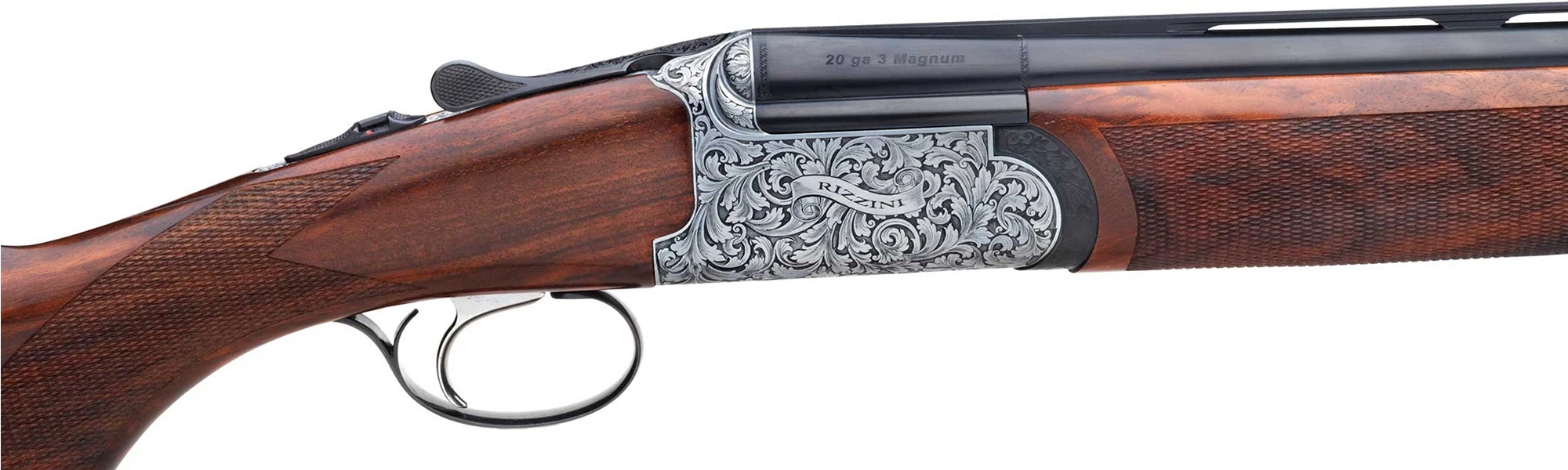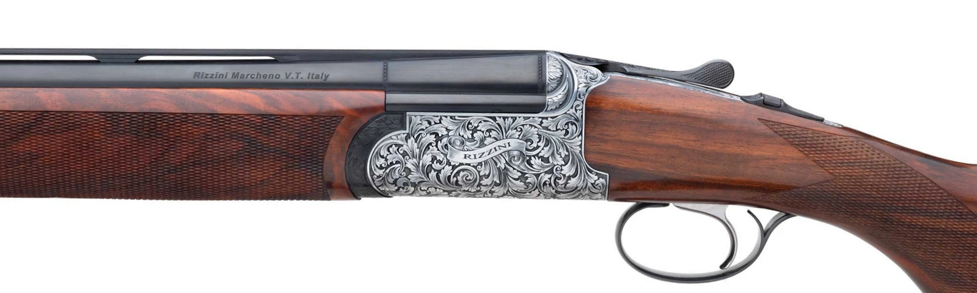Each Rizzini Round Body Game Gun features a rounded action fully engraved in a delicate foliate scroll, vibrant case colors or rich French gray finish, select Turkish walnut stock which is finely checkered and hand finished in oil, long tang trigger guard, chrome moly lined ventilated rib barrels with screw chokes.